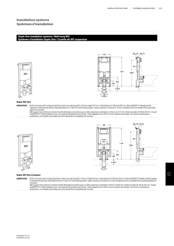Built-in structure with compact dual-flush cistern for wall-hung WC, minimum depth 107 mm. Axial distance of 180 and 230 mm. Elbow Ø90/Ø110. Metallic profile