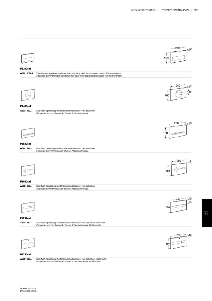 Dual flush operating plate for concealed cistern. Front activation.