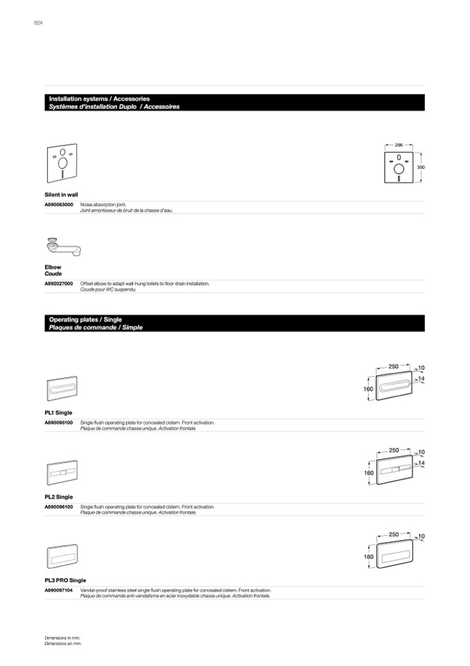Single flush operating plate for concealed cistern. Front activation.