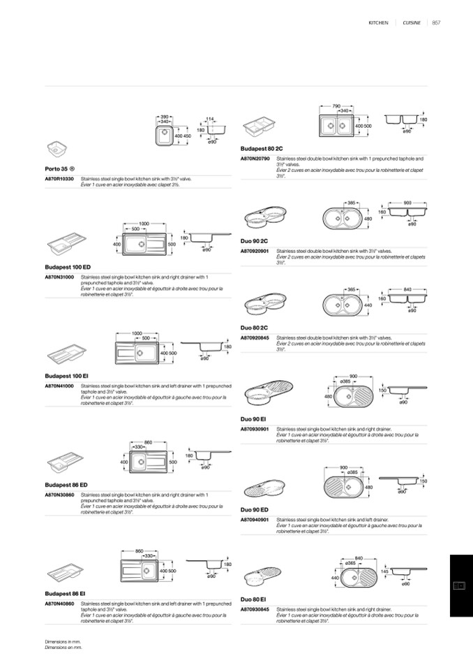 Stainless steel double bowl kitchen sink with 31⁄2" valves.