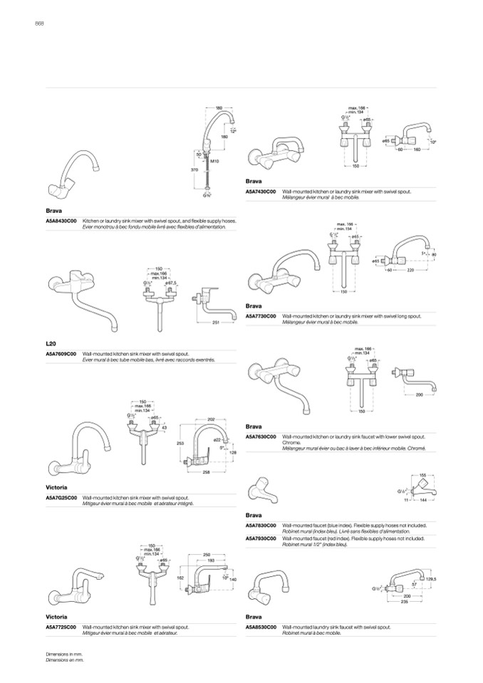 Wall-mounted faucet (blue index). Flexible supply hoses not included.