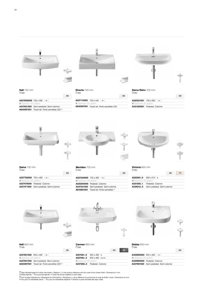 Voir la page indiquée pour développer les informations / Remplacer (..) de la référence du produit par le code de finition choisi / Dimensions en mm.