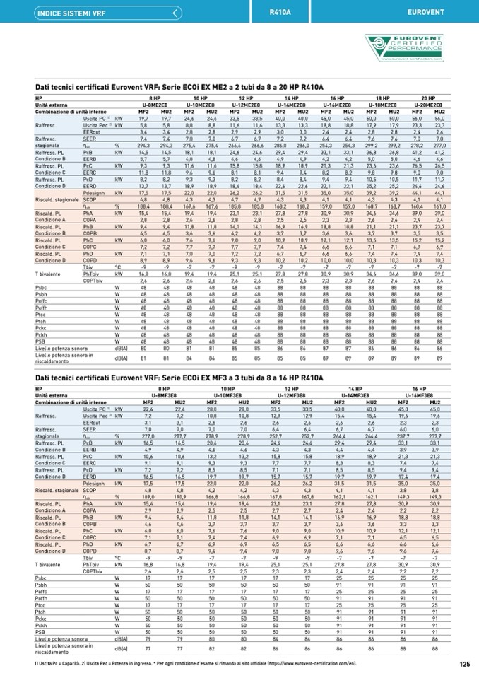 1) Uscita Pc = Capacità. 2) Uscita Pec = Potenza in ingresso. * Per ogni condizione d'esame si rimanda al sito ufficiale (https://www.eurovent-certification.com/en).