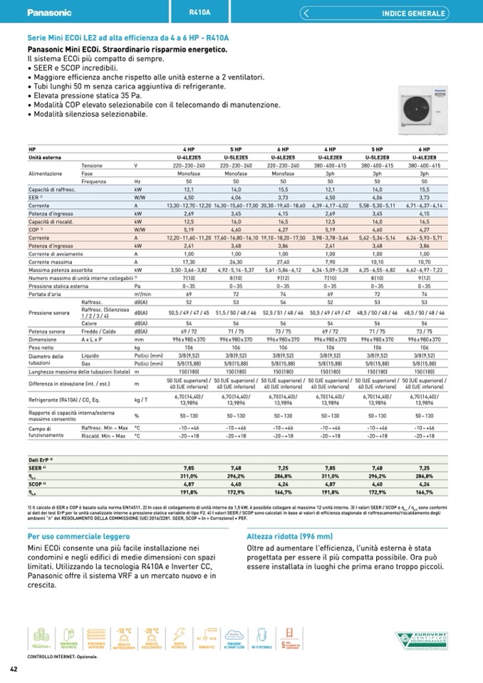 1) Il calcolo di EER e COP è basato sulla norma EN14511. 2) In caso di collegamento di unità interne da 1,5 kW, è possibile collegare al massimo 12 unità interne. 3) I valori SEER / SCOP e η