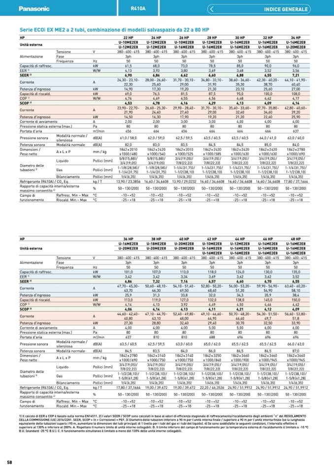 1) Il calcolo di EER e COP è basato sulla norma EN14511. 2) I valori SEER / SCOP sono calcolati in base ai valori di efficienza stagionale di raffrescamento/riscaldamento degli ambienti “η” del REGOLAMENTO