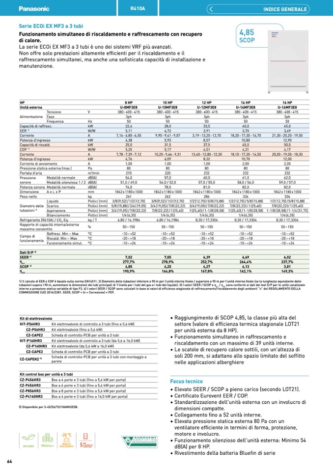 1) Il calcolo di EER e COP è basato sulla norma EN14511. 2) Diametro delle tubazioni inferiore a 90 m per l'unità interna finale / superiore a 90 m per l'unità interna finale (se la lunghezza equivalente delle