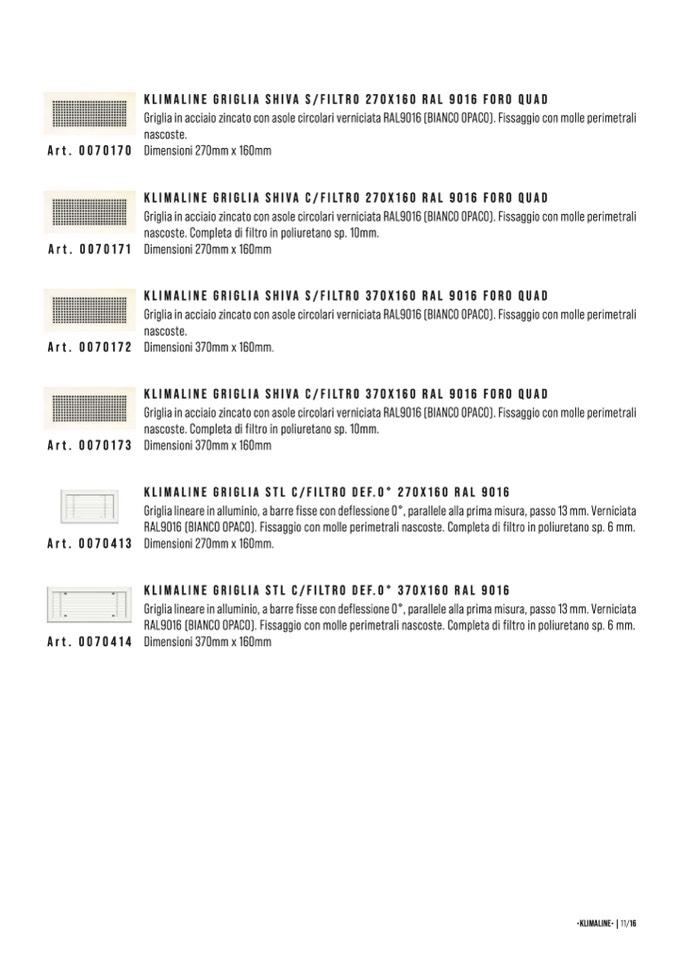 KLIMALINE GRIGLIA STL C/FILTRO DEF.0° 370X160 RAL 9016