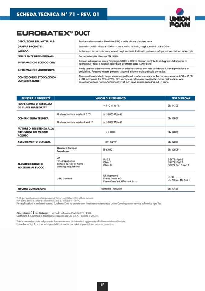 Per applicazioni in ambienti esterni, Eurobatex Duct va protetto con rivestimento esterno tipo Union Covering o con vernice polimerica tipo Vec.
