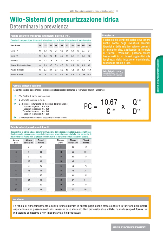 il calcolo della pressione necessaria in impianto, proponiamo una tabella che permette di