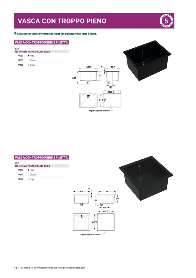 ʢ Le vasche con scarico Ø 40 mm sono fornite con griglia rimovibile, tappo e catena.