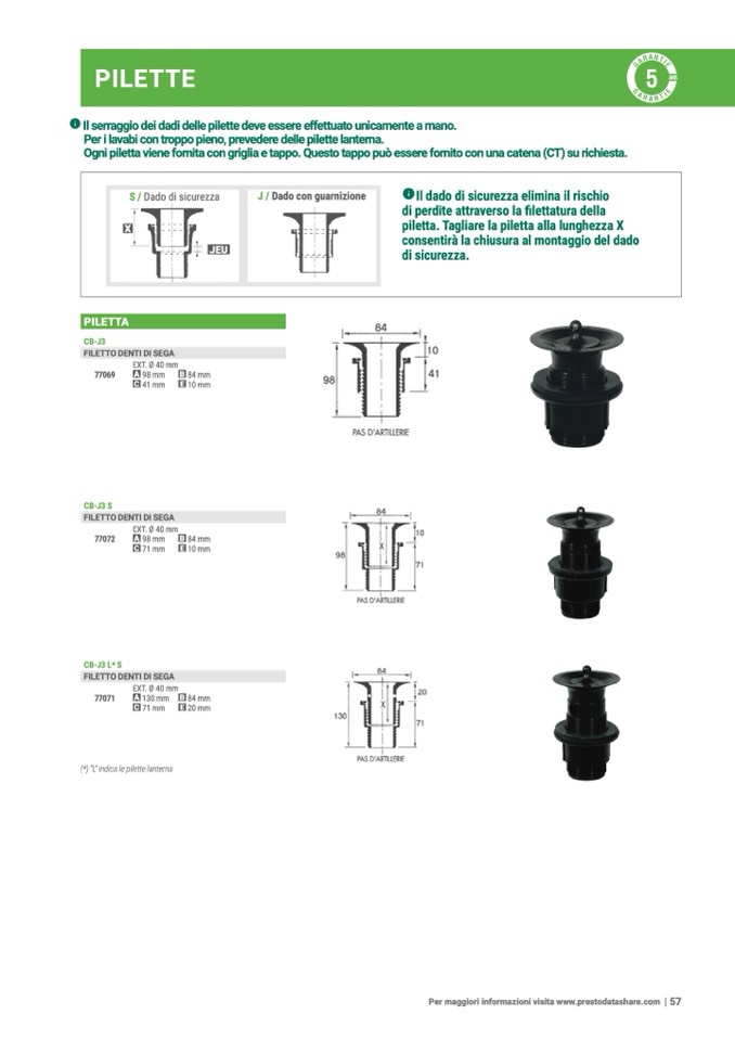 Ogni piletta viene fornita con griglia e tappo. Questo tappo può essere fornito con una catena (CT) su richiesta