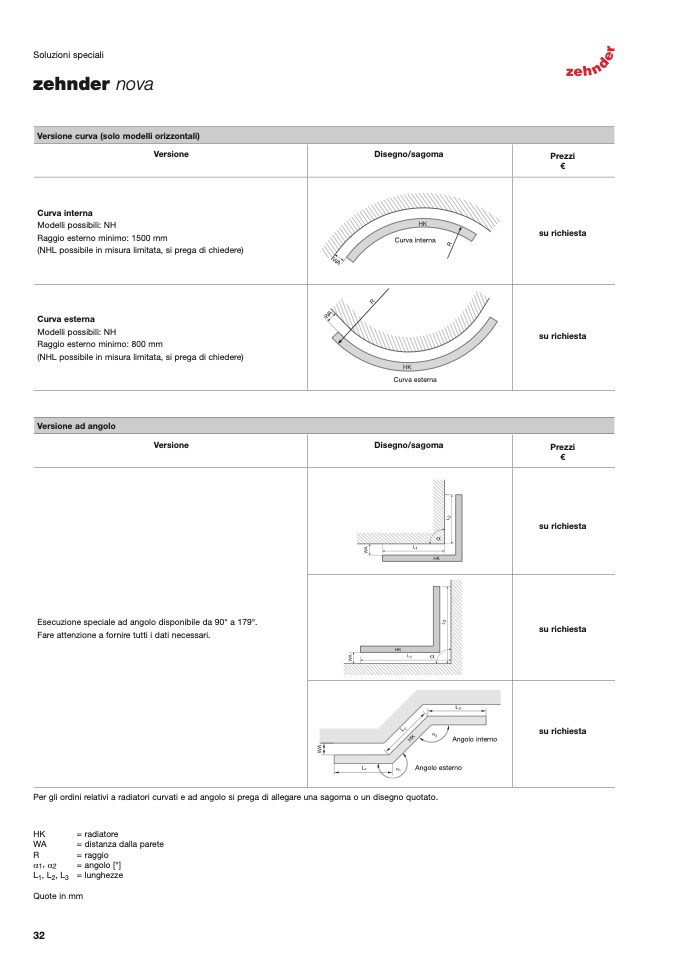 Per gli ordini relativi a radiatori curvati e ad angolo si prega di allegare una sagoma o un disegno quotato.