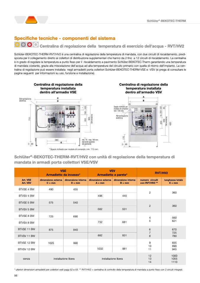 * ulteriori dimensioni armadietti per collettori vedi pagg 52 e 53. ** RVT/HV2 = centralina di controllo della temperatura di mandata a punto fisso con 2 circuiti integrati.