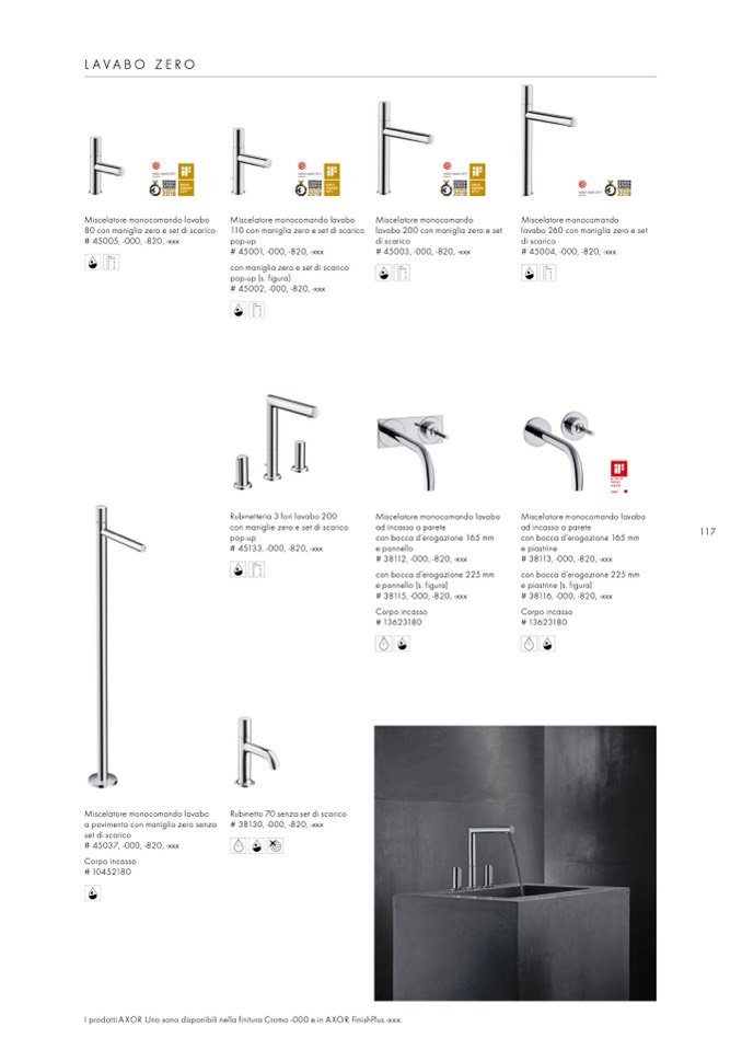 I prodotti AXOR Uno sono disponibili nella finitura Cromo -000 e in AXOR FinishPlus -xxx.
