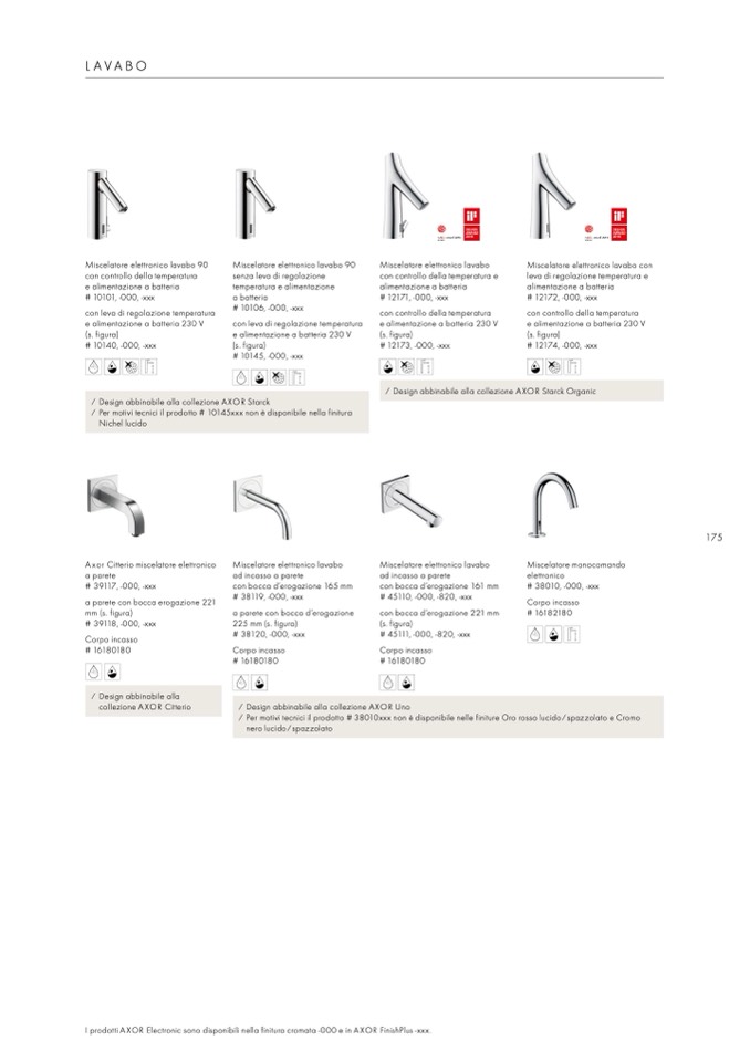 I prodotti AXOR Electronic sono disponibili nella finitura cromata -000 e in AXOR FinishPlus -xxx.