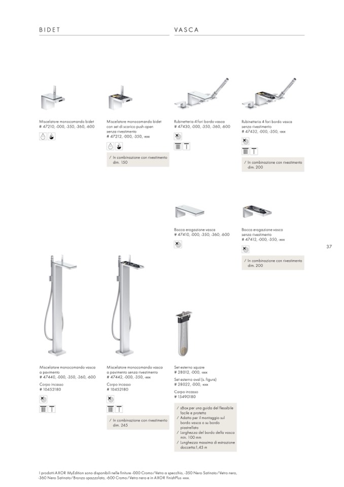 I prodotti AXOR MyEdition sono disponibili nelle finiture -000 Cromo ⁄ Vetro a specchio, -350 Nero Satinato ⁄ Vetro nero,