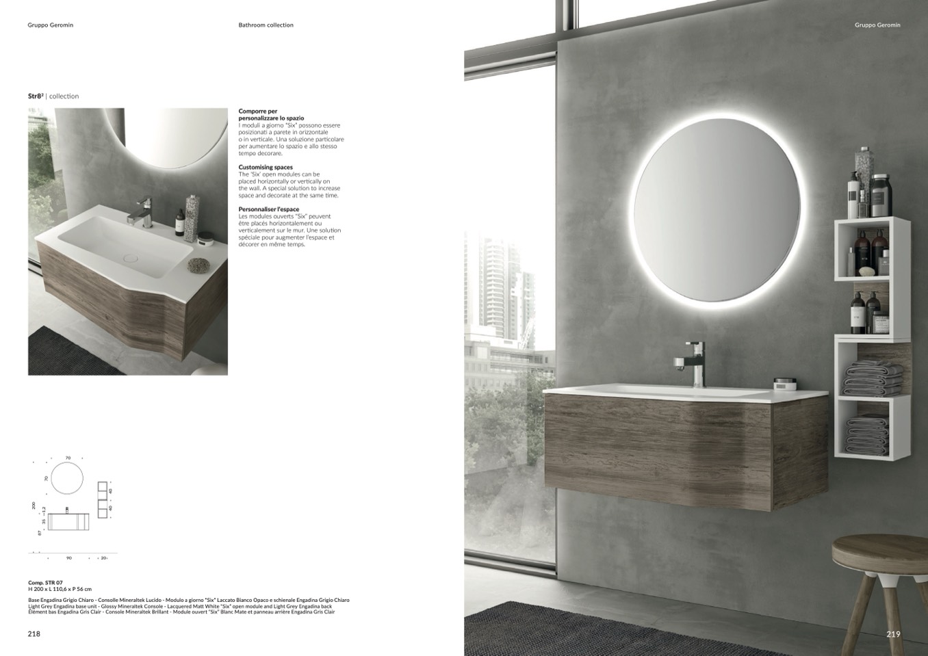 Élément bas Engadina Gris Clair - Console Mineraltek Brillant - Module ouvert “Six” Blanc Mate et panneau arrière Engadina Gris Clair
