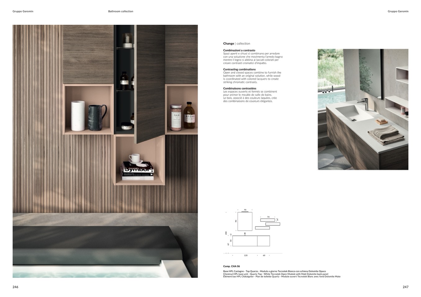 Élément bas HPL Châtaignier - Plan de toilette Quartz - Module ouvert Tecnotek Blanc avec fond Dolomite Mate