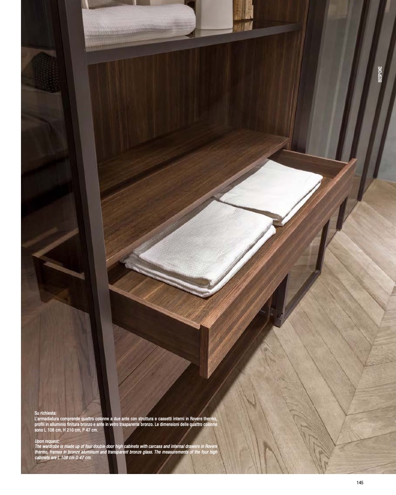 L’armadiatura comprende quattro colonne a due ante con struttura e cassetti interni in Rovere thermo,