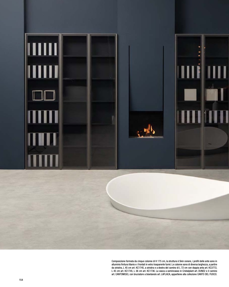 L 45 cm art. KC1745, L 36 cm art. KC1736. La vasca a semincasso in Cristalplant art. DUNE2 e il camino