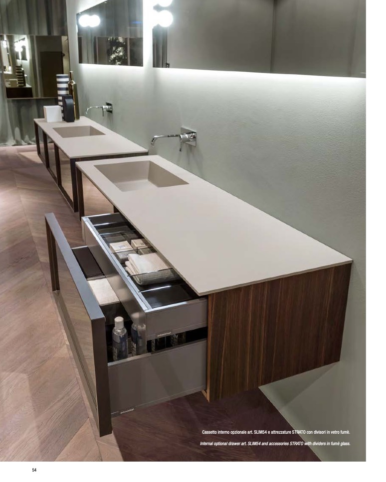Cassetto interno opzionale art. SLIM54 e attrezzature STRATO con divisori in vetro fumè.