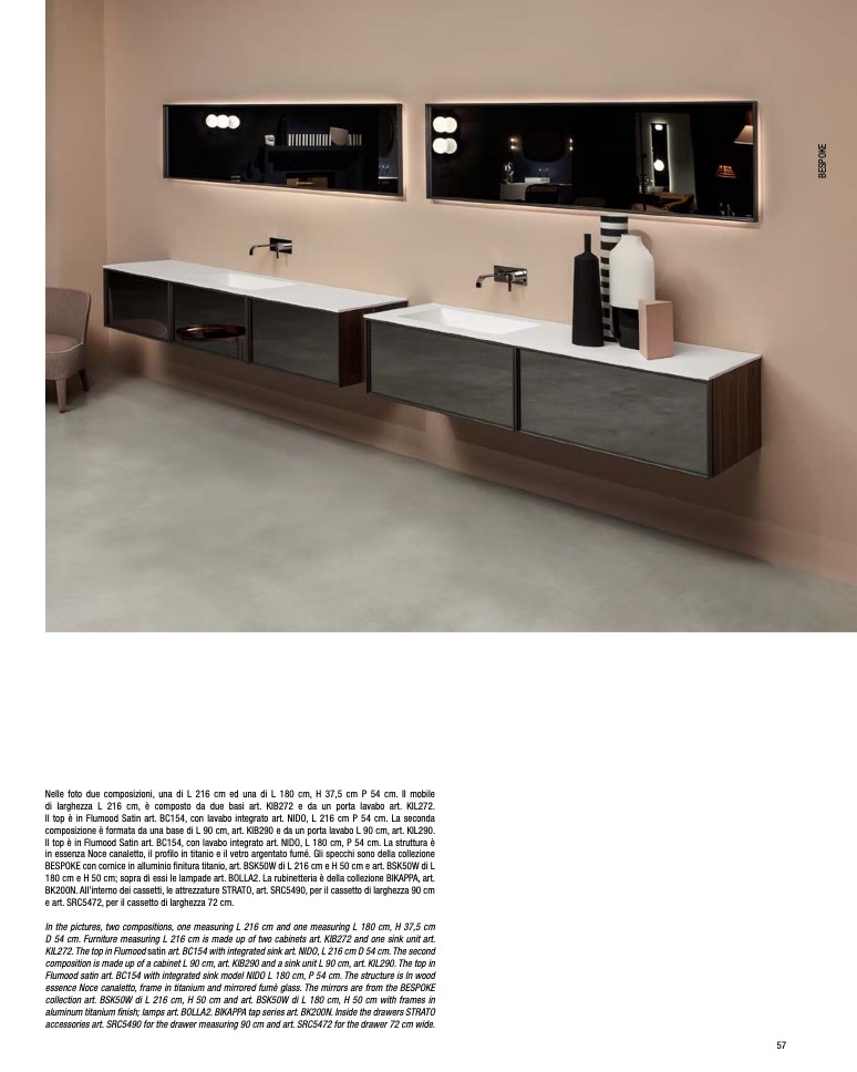 aluminum titanium finish; lamps art. BOLLA2. BIKAPPA tap series art. BK200N. Inside the drawers STRATO