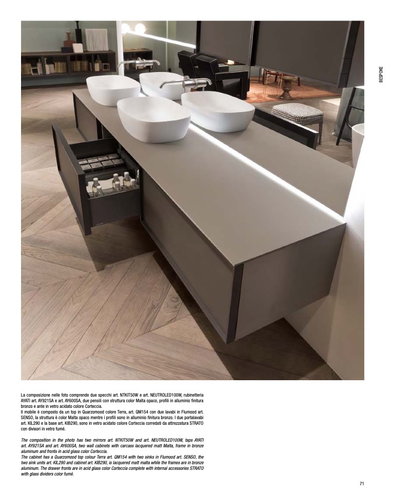 SENSO, la struttura è color Malta opaco mentre i profili sono in alluminio finitura bronzo. I due portalavabi