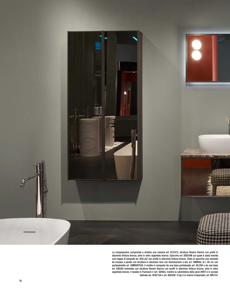 argentato bronzo. Il lavabo in Flumood è l’art. SENSO, mentre la rubinetteria della serie AYATI è in acciaio