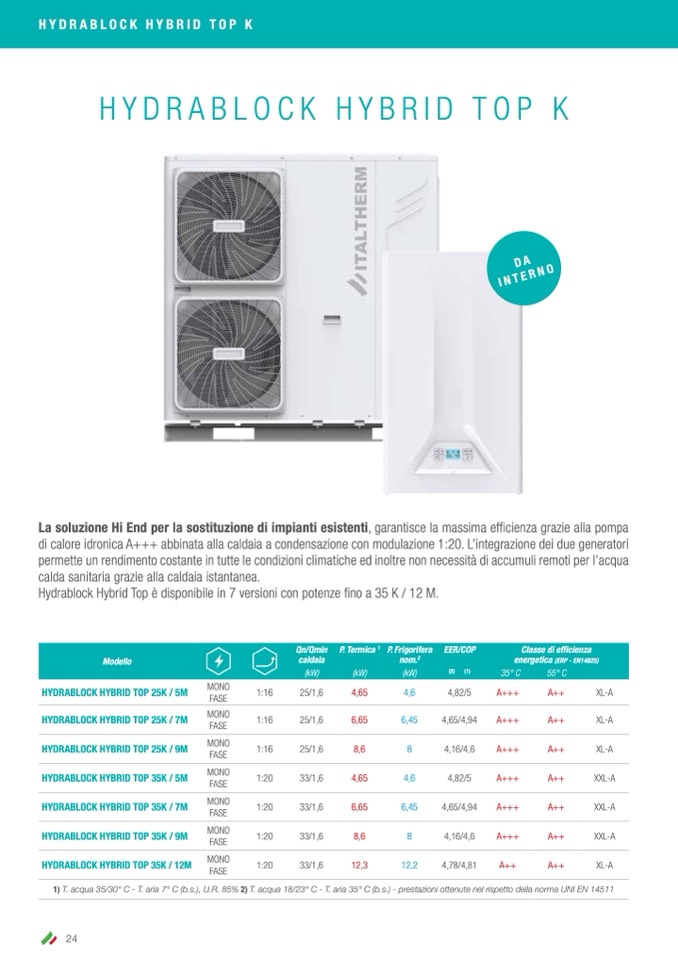 1) T. acqua 35/30° C - T. aria 7° C (b.s.), U.R. 85% 2) T. acqua 18/23° C - T. aria 35° C (b.s.) - prestazioni ottenute nel rispetto della norma UNI EN 14511