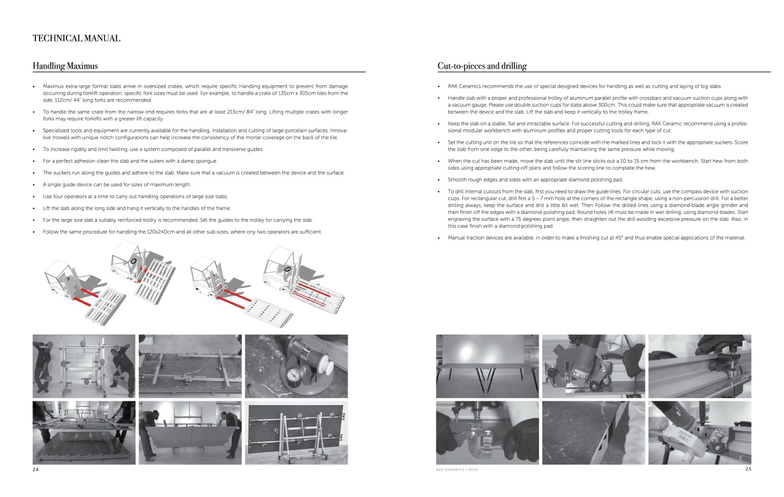 RAK Ceramics recommends the use of special designed devices for handling as well as cutting and laying of big slabs.