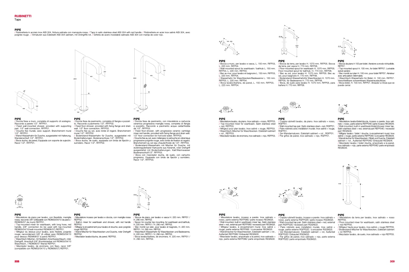/ Rubinetteria in acciaio inox AISI 304, finitura satinata con manopola rossa. / Taps in satin stainless steel AISI 304 with red handle.