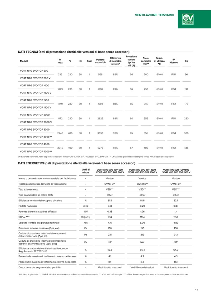 * NA: Non Applicabile. ** UVNR-B: Unità di Ventilazione Non Residenziale - Bidirezionale. *** VSD: Velocità Multiple. **** SFPint: Potenza specifica interna dei componenti della ventilazione.
