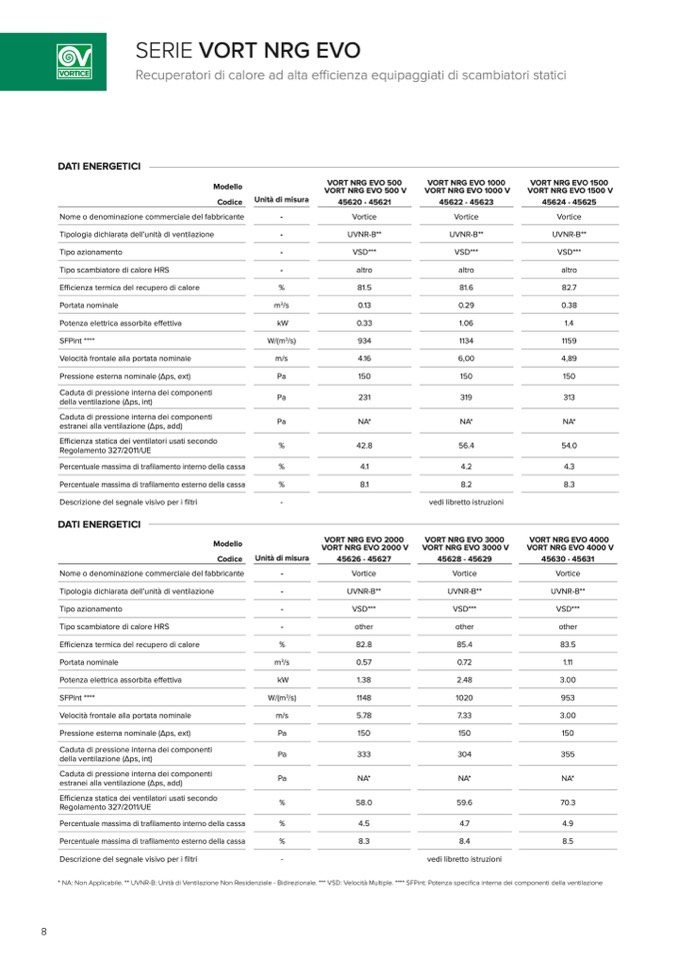 * NA: Non Applicabile. ** UVNR-B: Unità di Ventilazione Non Residenziale - Bidirezionale. *** VSD: Velocità Multiple. **** SFPint: Potenza specifica interna dei componenti della ventilazione