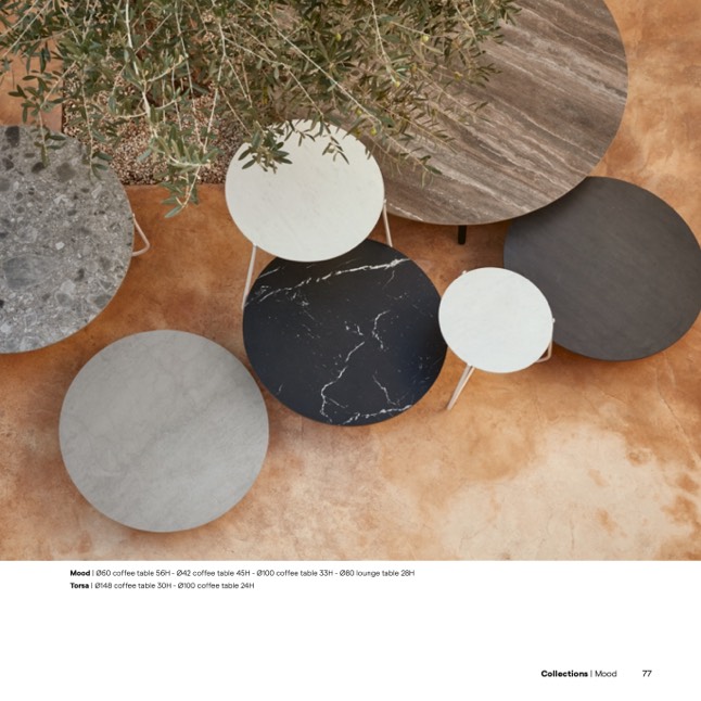 Mood | Ø60 coffee table 56H - Ø42 coffee table 45H - Ø100 coffee table 33H - Ø80 lounge table 28H