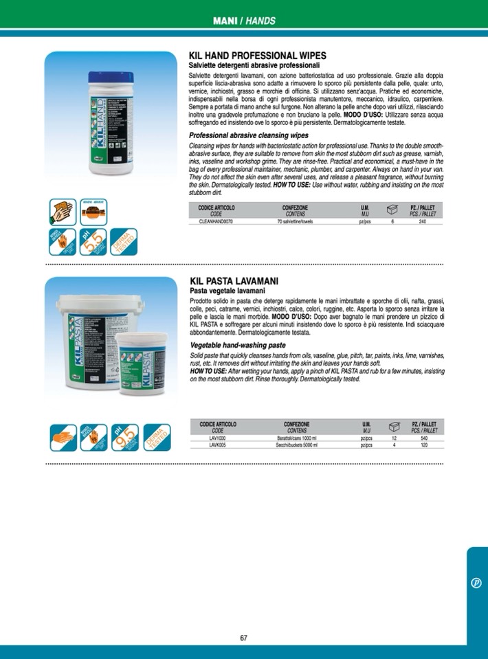 abrasive surface, they are suitable to remove from skin the most stubborn dirt such as grease, varnish,