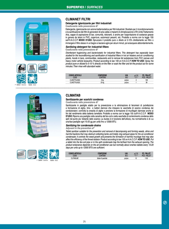sull’H.A.C.C.P. MODO D’USO: Spruzzare il prodotto puro o diluito al 5-10% direttamente sul filtro o