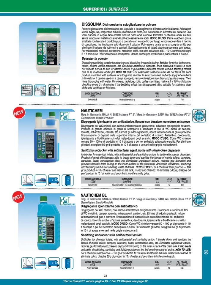 gr of product in 10 l of water and then in the tank, rinsed and cleaned. To eliminate odours, dissolve 50