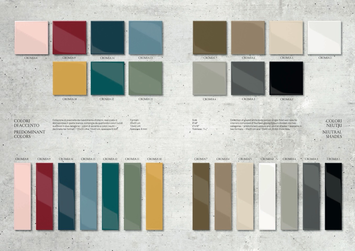 monoporosa in pasta bianca, composta da quattordici colori lucidi