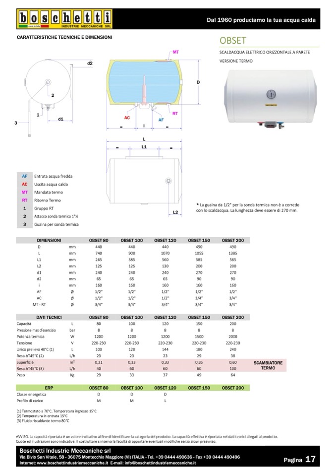 (1) Termostato a 70°C. Temperatura ingresso 15°C