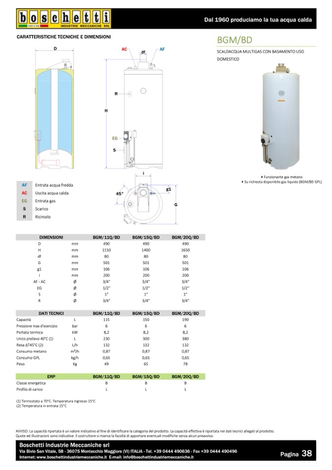 (1) Termostato a 70°C. Temperatura ingresso 15°C
