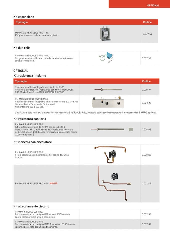 * L'abilitazione della resistenza, quando installata con MAGIS HERCULES PRO, necessita del kit sonda temperatura di mandata codice 3.030913 (optional).