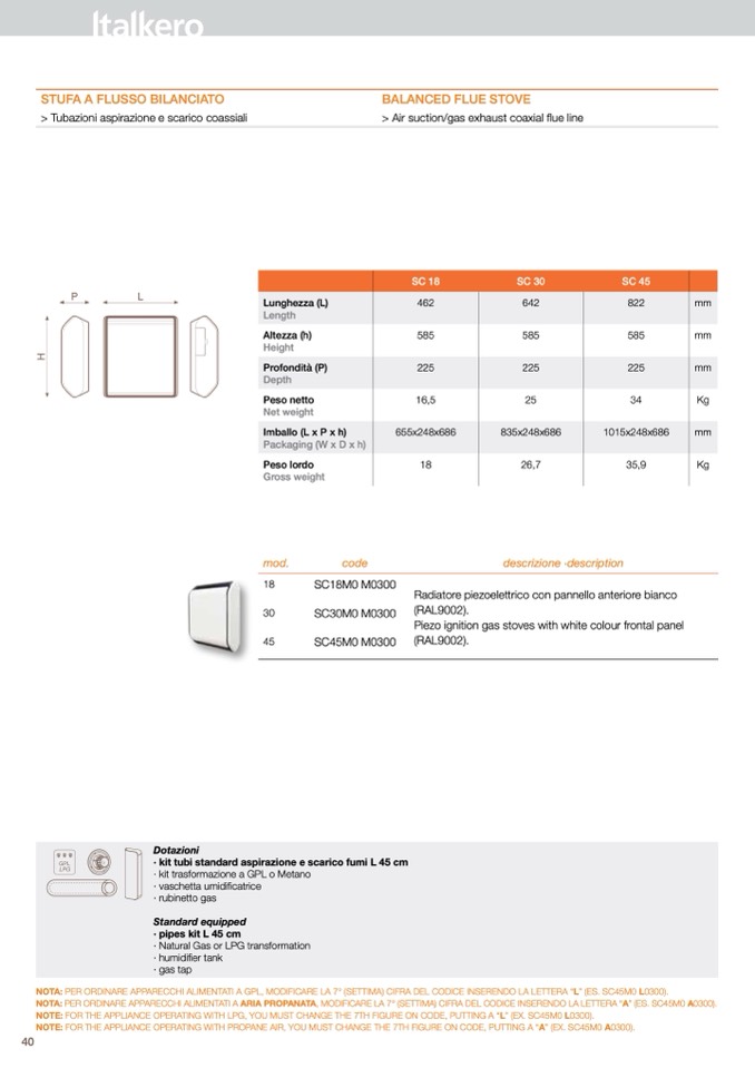 NOTE: fOR the appLIance OpeRatIng wIth Lpg, yOu MuSt change the 7th fIguRe On cOde, puttIng a “L” (ex. Sc45M0 L0300).