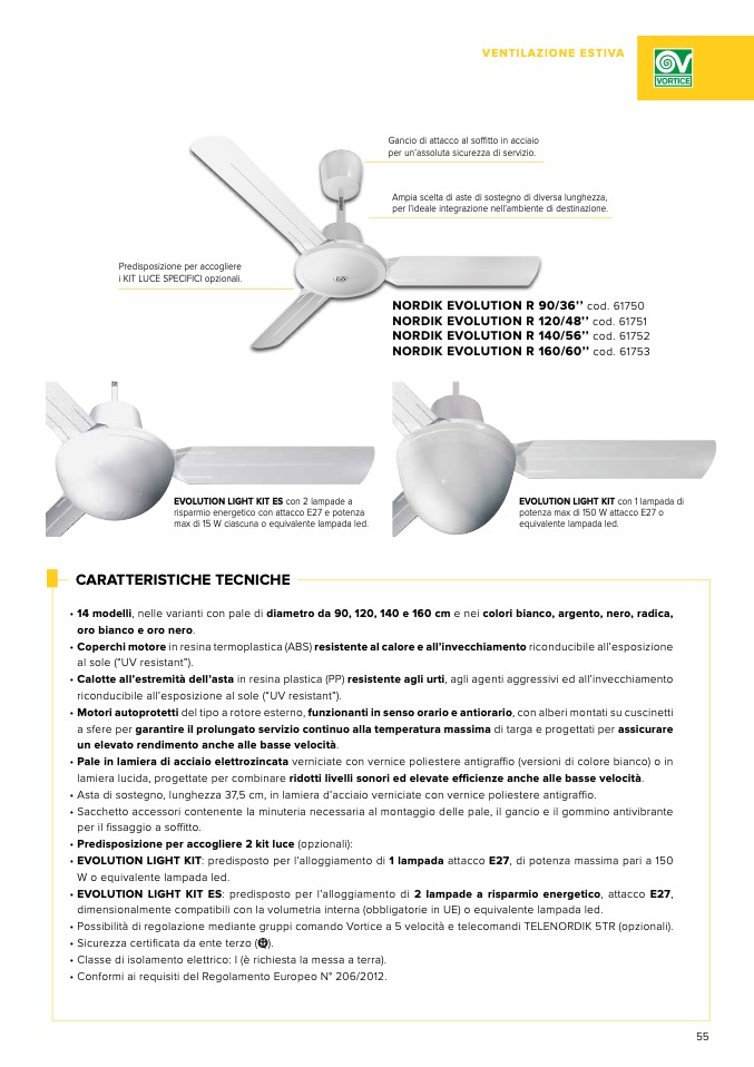 • 14 modelli, nelle varianti con pale di diametro da 90, 120, 140 e 160 cm e nei colori bianco, argento, nero, radica,