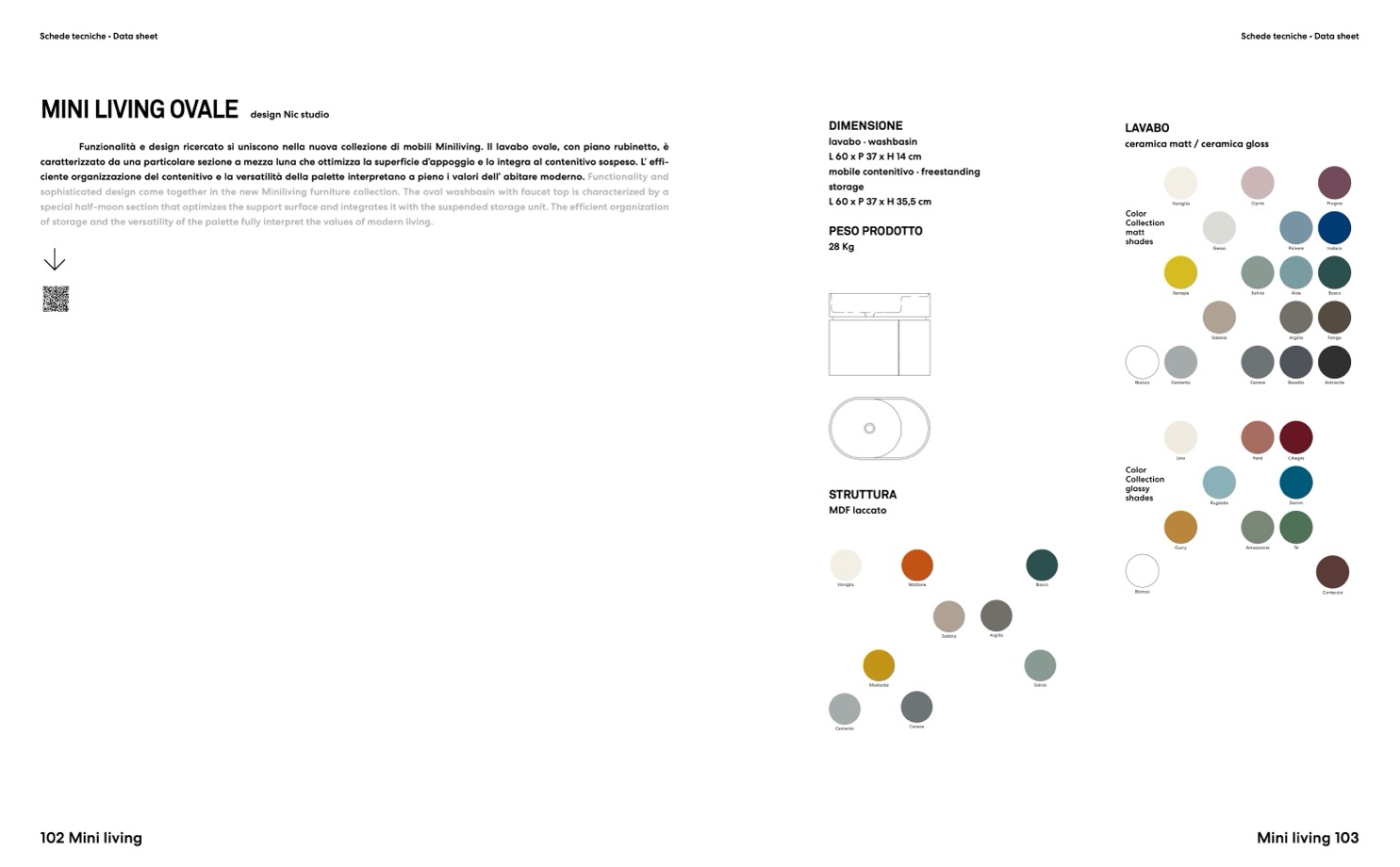 Funzionalità e design ricercato si uniscono nella nuova collezione di mobili Miniliving. Il lavabo ovale, con piano rubinetto, è