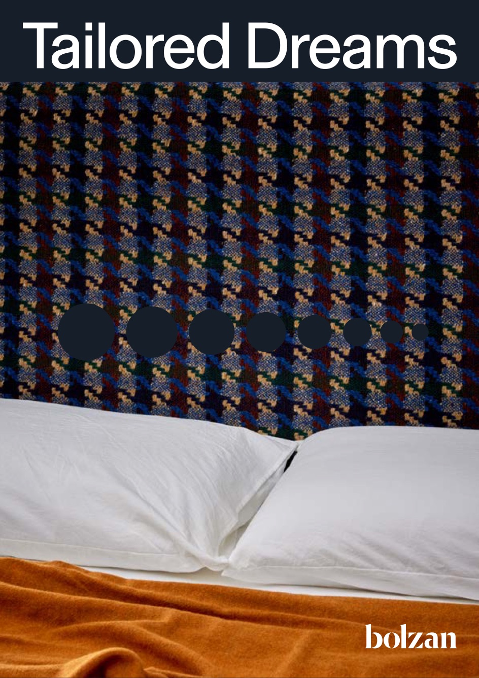 Bolzan tailored dreams se è vero, e lo è, che dormiamo per vivere, allora il sogno è la connessione più profonda con il mondo. perché è proprio quando mettiamo la giusta distanza tra un giorno e l’altro che stabiliamo il contatto migliore con noi stessi e con gli altri. è così che la parola sognatore cambia profondamente di significato. ci hanno insegnato a guardare i sognatori col sospetto che si deve ai romantici, e invece non c’è nessuno che sappia tenere i piedi per terra meglio di chi sogna, e sogna bene. sognare vuol dire guardare al futuro con la mente aperta al cambiamento. è quello che bolzan si propone da sempre nella sua lunga storia di atelier del sonno: far crescere per qualità la sua offerta mirata di letti e di altri arredi, ritagliarli sulle esigenze specifiche del pubblico e portarli, quando occorre, fuori dalla zona notte, per mettere in connessione quelle due metà della vita che in nessun altro posto come la casa devono scrivere un’unica sceneggiatura: la nostra. la proposta di bolzan per la casa è fatta di letti e di complementi che tessono un filo speciale, ispirato all’idea contemporanea dell’abitare fluido, in continuo dive- nire. per questa ragione, troverete nelle pagine che seguono arredi pensati per la zona notte che allo stesso tempo sono fatti per popolare, con la loro personalità spiccata, anche la zona giorno della casa. le nostre creazioni sono frutto di una expertise d’eccellenza nel tessile, unita alla sapienza artigianale delle migliori maestranze di una filiera a km 0. il tutto, guidato dal design che ispira il catalogo non soltanto in senso estetico, ma come viatico per una produzione sostenibile e attenta all’ambiente.