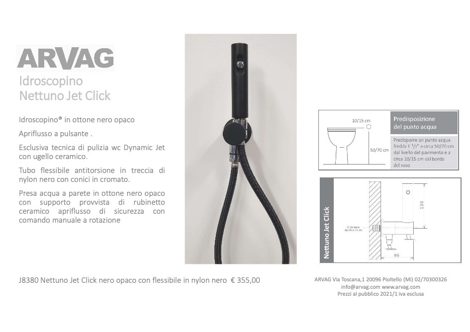 Arvag idroscopino® in ottone nero opaco apriflusso a pulsante . esclusiva tecnica di pulizia wc dynamic jet con ugello ceramico. tubo flessibile antitorsione in treccia di nylon nero con conici in cromato. presa acqua a parete in ottone nero opaco con supporto provvista di rubinetto ceramico apriflusso di sicurezza con comando manuale a rotazione j8380 nettuno jet click nero opaco con flessibile in nylon nero € 355,00