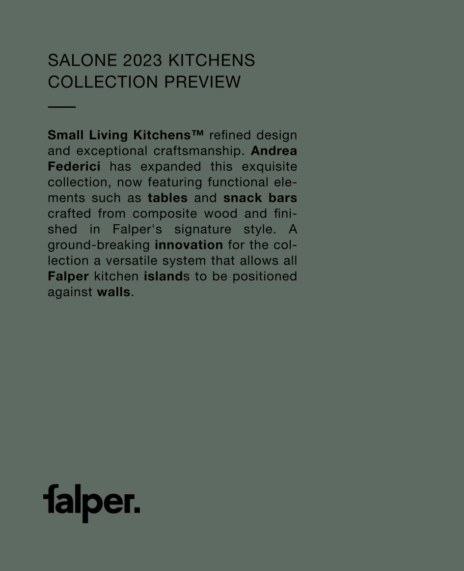 Falper designer e art director, andrea federici si occupa dello sviluppo di intere collezioni di cucine e mobili del bagno per falper, con un percorso di ricerca iniziato circa una decina di anni fa. le cucine small living kitchenstm, elette miglior progetto di cucina con il premio edida 2023, sono state disegnate rivolgendosi a coloro che abitano in piccole metrature dal gusto estremamente raffinato, oggetti preziosi e rappresentativi del loro status. designer and art director andrea federici develops entire collections of kitchens and bath furnishings for falper, the culmination of ten years in the pursuit of innovative design. falper’s small living kitchenstm, winner in the best kitchen category of the 2023 edida awards, are designed for people who live in small spaces that reflect highly sophisticated taste – exclusive objects that represent their status.