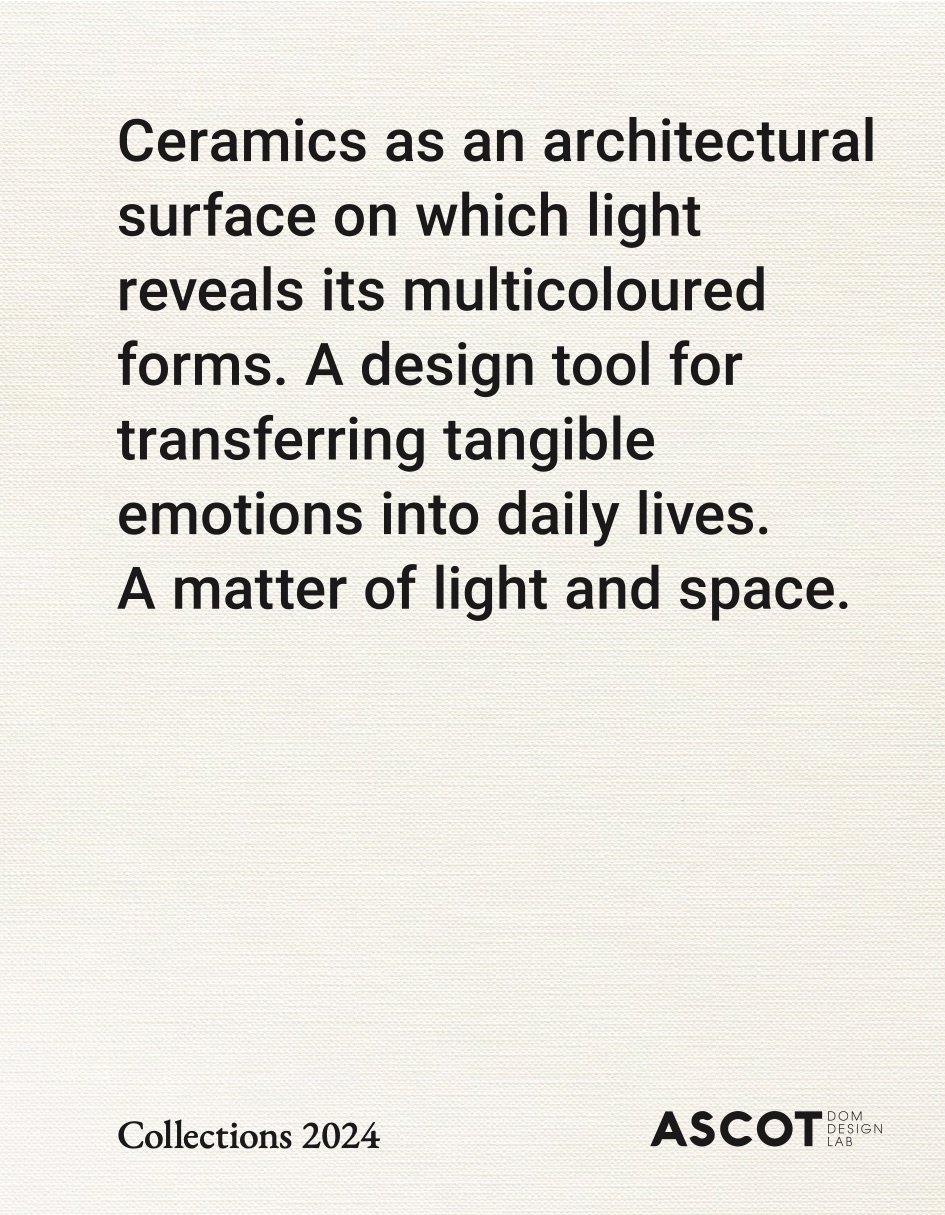 Ascot due eccellenze del settore ceramico, ascot everytile e dom design lab, si uniscono per dare vita a un’unico brand più dinamico e competitivo. oltre quarant’anni di esperienza di ascot everytile nella produzione di pavimenti e rivestimenti si fondono con la creatività e l’innovazione di dom design lab. nasce una gamma di prodotti e servizi ancora più ampia e completa, per offrirti soluzioni personalizzabili e adattabili alle esigenze di qualsiasi progetto e ambiente.